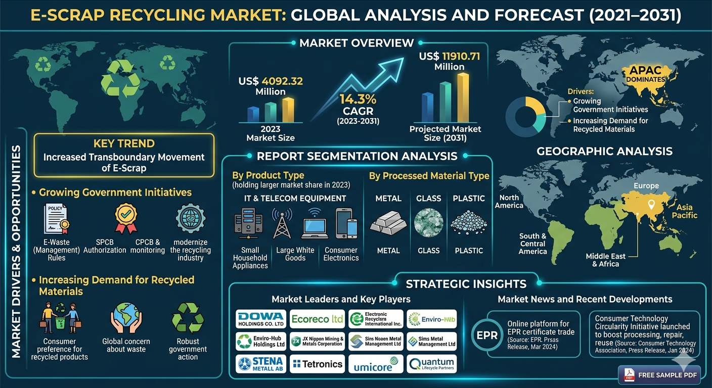 The E-scrap Recycling Market Size in North America is experiencing strong growth due to supportive regulatory frameworks, technological innovation, and increasing awareness about sustainability. The market size is projected to grow from US$ 4,092.32 million in 2023 to US$ 11,910.71 million by 2031, registering a CAGR of 14.3% during 2023–2031. The region remains a key contributor to this growth due to the presence of well-established recycling infrastructure and major industry players actively investing in advanced recovery solutions.