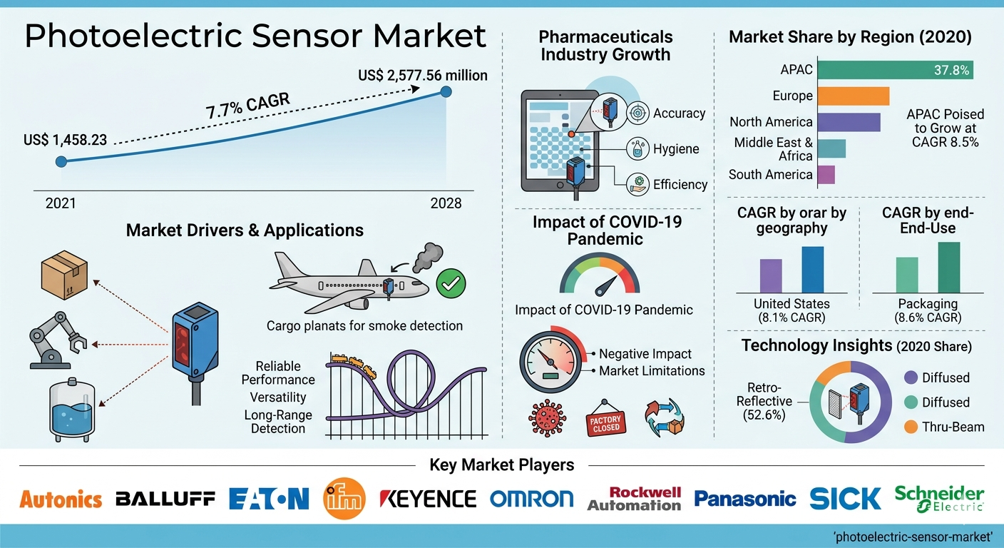 The Photoelectric Sensor Market Size in North America is experiencing strong growth due to rapid industrial modernization and increasing deployment of automation technologies across manufacturing sectors. The market was valued at US$ 1,458.23 million in 2021 and is projected to reach US$ 2,577.56 million by 2028, expanding at a CAGR of 7.7% from 2021 to 2028. Rising adoption of robotics in production facilities, increasing demand for precision-based manufacturing, and strong growth in logistics and warehousing automation are significantly contributing to market expansion across the region. As industries continue to upgrade their production infrastructure, photoelectric sensors are becoming essential components in achieving higher efficiency and operational reliability.