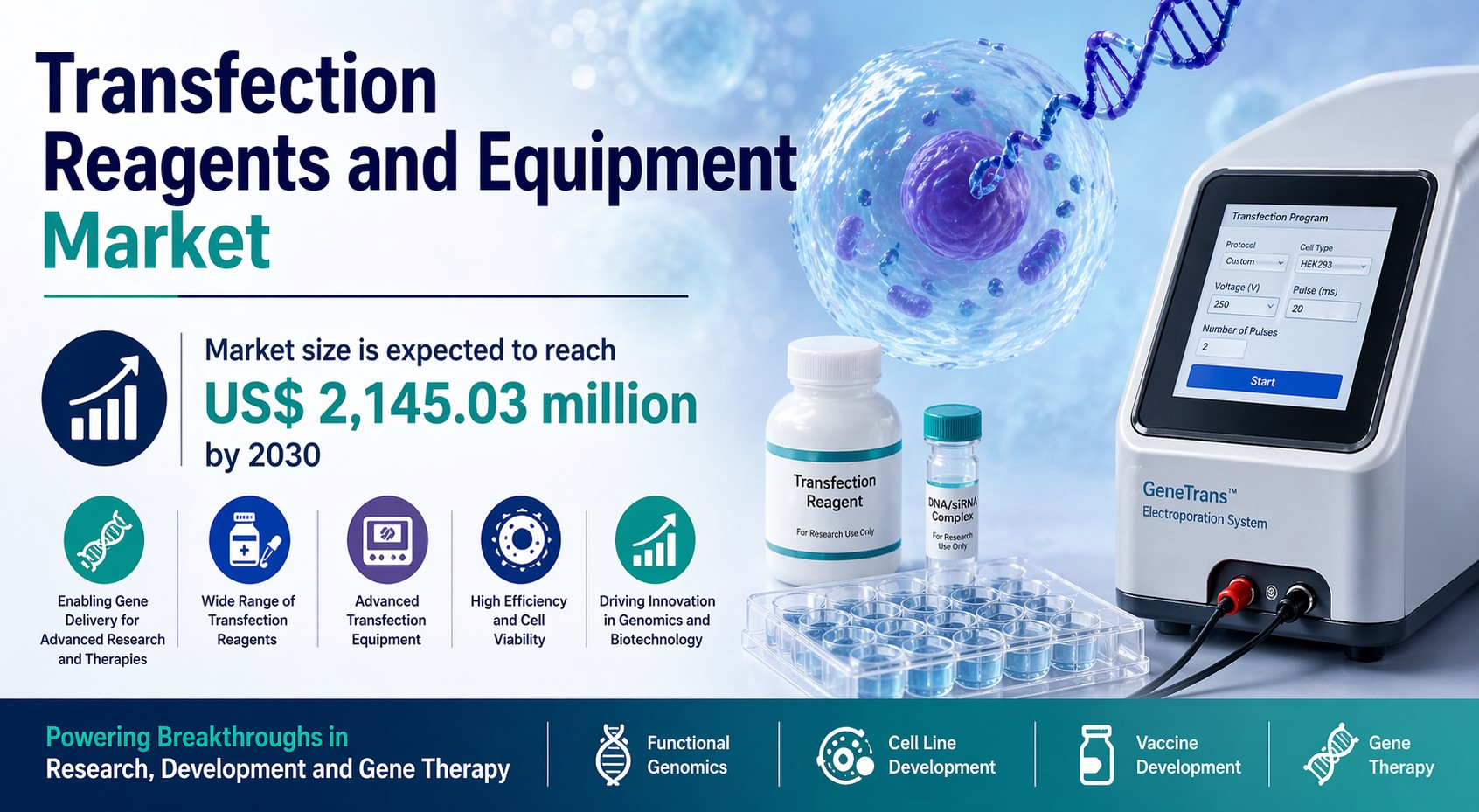 The transfection reagents and equipment market is gaining significant traction as the demand for efficient gene delivery systems continues to rise across biotechnology, pharmaceutical, and academic research sectors. Transfection technologies play a pivotal role in introducing nucleic acids into cells, enabling gene expression studies, therapeutic development, and advanced drug discovery. With increasing global focus on molecular biology and genetic engineering, the adoption of reliable and high-performance transfection tools is expanding rapidly.