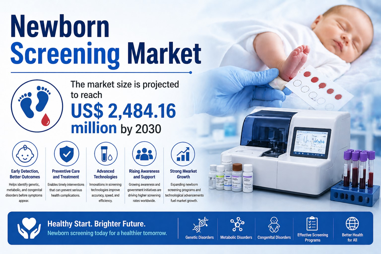 The newborn screening market is gaining significant traction globally as healthcare systems prioritize early diagnosis and preventive care for infants. With the increasing incidence of genetic, metabolic, and congenital disorders, early screening has become essential to ensure timely medical intervention. According to The Insight Partners, the market is projected to grow from US$ 1,206.74 million in 2022 to US$ 2,484.16 million by 2030, registering a CAGR of 9.40% during 2022–2030. This growth is driven by expanding healthcare infrastructure, increasing awareness among parents, and technological advancements in screening methodologies.